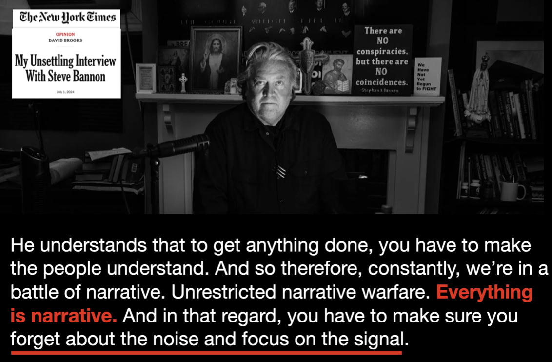 It’s now out of control. Misinformation (= noise) is everywhere. We are in “The Information Maelstrom” that Marshall McLuhan predicted (and not surprisingly Bannon in that interview cited McLuhan in reference to Trump). Noise is now the enemy of society. Signal is the only hope.